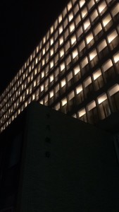 会場で一番驚いたのは、土俵上の切妻屋根が吊られて浮かんでいるということ。